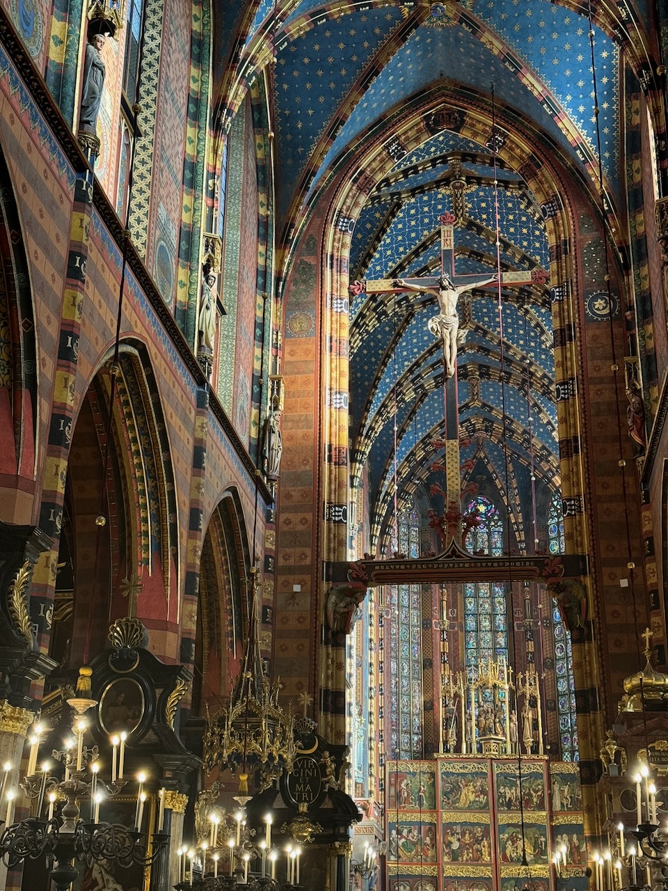 If you’re visiting Krakow, even for a few hours, you have to try to get into the basilica to witness its beautiful interior. You don’t need to buy a ticket to enter the church during prayer hours, as everyone is allowed to step in. You can admire its starry ceiling created by Jan Matejko, which creates the illusion of being under the stars. Additionally, it’s not everywhere that you get to see an original 15th-century wooden altarpiece. The church’s stained glass windows are also a sight to behold.