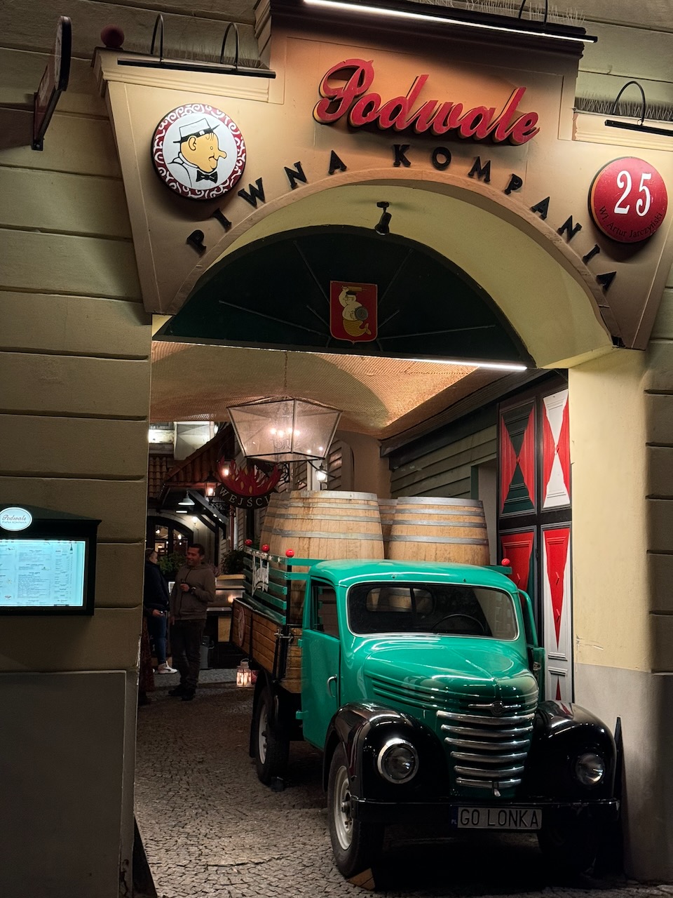 Podwale 25 Kompania Piwna is a Bavarian-style restaurant that serves authentic Polish cuisine. The interior is lively and welcoming, with servers dressed in traditional Polish costumes. The menu includes hearty dishes like pierogi, bigos, and schnitzel, all served in generous portions. The atmosphere is enhanced by live music in the evenings, making it a great place to enjoy a meal with friends or family.